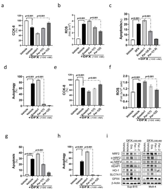 The NRF2 signalling pathway mediates DFX-induced ferroptosis in leukaemia cell lines. (a,b) Cell viability was evaluated using CCK-8 after treating Sup-B15 and Molt-4 cells with a combination of 100 nM DFX and either erastin or ferrostatin-1 for 24 h. (c,d) Following 24 h exposure of Sup-B15 and Molt-4 cells to a combination of 100 nM DFX and either erastin or ferrostatin-1, intracellular ROS levels were measured as fold increases in fluorescence relative to the negative control. (e,f) The percentage of apoptotic Sup-B15 and Molt-4 cells was determined after treatment with DFX and either erastin or ferrostatin-1. (g,h) The percentage of autophagic Sup-B15 and Molt-4 cells was determined after treatment with DFX and either erastin or ferrostatin-1. (i) Western blotting was conducted to assess NRF2, p-NRF2, Ac-NRF2, KEAP1, HO-1, GPX4, and SLC7A11 levels in lysates of Sup-B15 and Molt-4 cells after treatment with DFX and either erastin or ferrostatin-1.