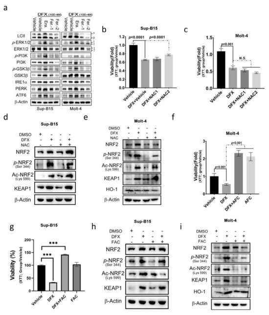 N-acetyl cysteine (NAC) cannot reverse the effect of DFX on ALL cells. (a) Sup-B15 and Molt-4 cells were subjected to Western blot analysis to examine the expression of the UPR sensor, and the PI3K, MAPK, and GSK3β signalling pathways following treatment with DFX and either erastin or ferrostatin-1. (b,c) After 24 h treatment of Sup-B15 and Molt-4 cells with DFX and NAC, cell viability was assessed using an XTT assay. (d,e) Western blotting was conducted to assess NRF2, p-NRF2, Ac-NRF2, KEAP1, and HO-1 levels in lysates of Sup-B15 cells after DFX and NAC treatment. (f,g) After 24 h treatment of Sup-B15 and Molt-4 cells with DFX and ferric ammonium citrate (FAC), cell viability was assessed using an XTT assay. ***, p < 0.001. (h,i) Western blotting was conducted to assess NRF2, p-NRF2, Ac-NRF2, KEAP1, and HO-1 levels in lysates of Sup-B15 cells after DFX and FAC treatment.