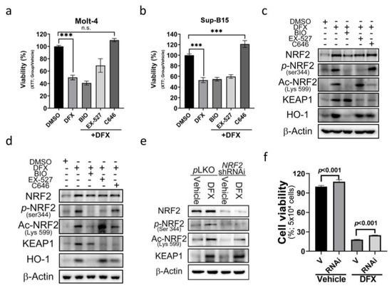 The effect of DFX on ALL cells can be reversed by an E1A binding protein p300/CREB binding protein (p300/CBP) inhibitor. (a,b) Cell viability was evaluated using an XTT assay after 24 h treatment of Sup-B15 and Molt-4 cells with DFX and different specific chemical inhibitors, including BIO (GSK-3 inhibitor), EX-527 (SIRT1 inhibitor), and C646 (p300/CBP inhibitor). ***, p < 0.001. (c,d) Western blotting was conducted to assess NRF2, p-NRF2, Ac-NRF2, KEAP1, and HO-1 levels in lysates of Sup-B15 and Molt-4 cells after treatment with DFX and different specific chemical inhibitors, including BIO (GSK-3 inhibitor), EX-527 (SIRT1 inhibitor), and C646 (p300/CBP inhibitor). (e) Western blotting was conducted to assess NRF2, p-NRF2, Ac-NRF2, and KEAP1 levels in lysates of Sup-B15 cells after treatment with DFX and NRF2 shRNAi. (f) Cell viability was evaluated using an XTT assay after 24 h treatment of Sup-B15 cells with DFX and NRF2 shRNAi.