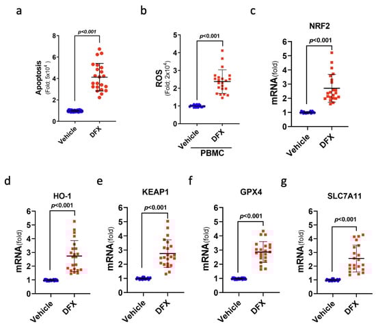 To further verify the cytotoxic impact of DFX on leukaemia cells, 22 ALL samples from patients were used to study ferroptosis-related gene expression and cell viability after DFX treatment in a controlled in vitro setting. Notably, DFX treatment yielded substantial increases in cellular death (apoptosis) and intracellular ROS levels in the leukaemia cells of patients with ALL (Figure 6a,b). As anticipated, DFX administration also yielded a significant augmentation in the mRNA levels of genes pertinent to ferroptosis, namely, NRF2, KEAP1, HO-1, GPX4, and SLC7A11, within the leukaemia cells of individuals with ALL (Figure 6c–g). These findings indicate the engagement of ferroptosis-related signals in cases of ALL, highlighting the prospective therapeutic value of anti-ferroptotic interventions in future clinical contexts.