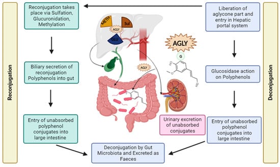 Polyphenols post-consumption is digested in the stomach. In their native forms, polyphenols are present as conjugates with, majorly, a glycosidic side chain. These conjugations render the absorption of polyphenols by the small intestine rather difficult. Extracellular enzymes, such as glucosidases, help deconjugate the polyphenol, thus aiding in its absorption. Unabsorbed polyphenols are transferred to the large intestine where they undergo microbial modification to facilitate absorption. The deconjugated polyphenols are transferred to the liver via the hepato-portal vein, where most polyphenol metabolism occurs. Polyphenols are reconjugated in the liver with the help of various enzymes and make their way to the target sites. The liver also helps in excretion of excess polyphenols. Polyphenols are excreted in two major ways: urinary excretion by kidneys and biliary excretion, which are further processed and excreted finally as feces. The illustration is depicted in Figure 4 [87].