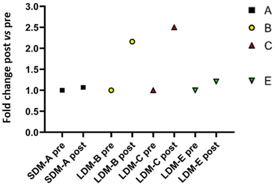 Scatter plot of NOS1 quantitative PCR (qPCR) data from soleus muscles from one (n = 1) SDM astronaut (SDM-A, 9 ISS days, black squares) and three (n = 3) LDM astronauts (LDM-B, yellow circle/C, red triangles/E, green triangles, 180 ISS days or more). NOS1 transcript levels were elevated in LDM-B and C (2–2.5-fold change) or in LDM-E (trend only) vs. SDM condition post- vs. preflight. Astronaut D values not available (tissue limitation).