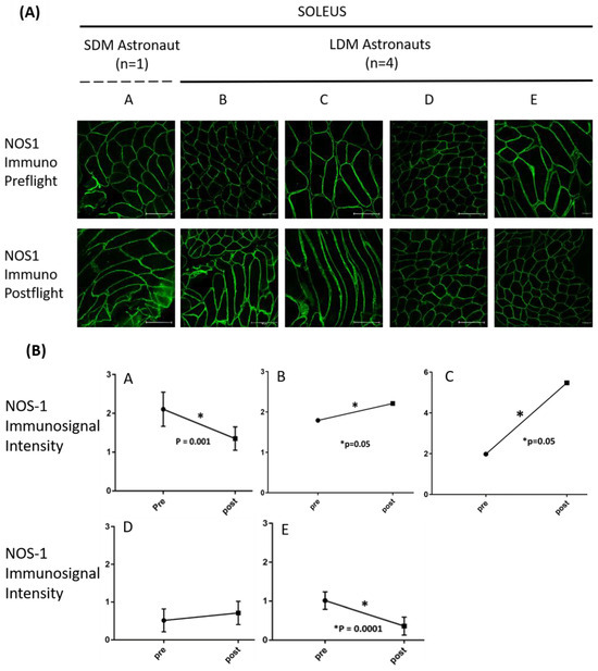 Quantitative analysis of NOS1 immunosignal pixel intensities confirmed that, in the soleus muscle of at least two LDM crew members (B, C; p = 0.001), subsarcolemmal NOS1 localization (p = 0.001) was increased, whereas no change was found in astronaut D and reduced NOS1 signal intensities were found in astronaut E post- vs. pre-flight (Figure 3A).