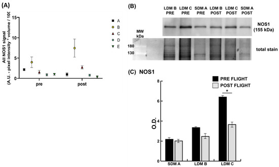 (A) Graph (scatter plot) showing sarcolemmal anti-NOS1 immunosignal pixel changes (pre- vs. postflight) in the soleus muscle (left panel) of LDM astronauts B, C, D, and E (n = 4) vs. one SDM astronaut (A, n = 1) as reference control. Color codes of astronaut values (as presented by square, circle, triangles, diamond symbols) highlight inter-subject variability (see astronaut B and E). (B) Representative NOS1 immunoblot images from SDM-A, LDM B, and LDM-C. (C) Representative bar graph (means ± SD) showing quantitative pre-flight (black bars) vs. post-flight (grey bars) NOS1 protein change in soleus lysates. Data were normalized against the total amount of loaded proteins stained with Sypro Ruby. O.D. = optical density; * significant difference; Student’s t-test, n = 2, p < 0.05. Full-length images are available in the Supplementary Materials. Astronaut D and E immunoblot values not available (tissue limitation).