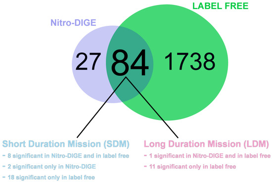 We then assessed the abundance of proteoforms provided by the Nitro-DIGE technology, which generates typical “nitro-profiles” from SNO proteins based on a modified biotin switch method [40] in which the labile SNO group is selectively reduced with ascorbate and labelled with CyDyes. Analyses were performed on pre- and post-flight soleus biopsy samples from a single non-exercise SDM astronaut (n = 1) and four LDM astronauts (n = 4) performing daily routine countermeasure protocols during their stay aboard the ISS. Changes in nitrosylation levels were assessed for each protein by normalizing the Nitro-DIGE level over the label-free LC-MS/MS abundance dataset previously published based on the same subjects [39]. Proteins showing both decreased abundance and nitrosylation or vice versa, after microgravity exposure, were not considered, as we would like to identify proteins that are over- or under-nitrosylated compared to under- or over-expressed total protein. A total of 1822 proteins were identified from SDM and LDM astronaut soleus muscle in the label-free analysis, whereas 111 spots were found nitrosylated in Nitro-DIGE, among which 84 were present in the label-free dataset (Figure 4). Of the 84 nitrosylated proteins identified, in SDM exposure, eight showed statistically significant differential expression in both Nitro-DIGE and label-free data, two were significantly over-nitrosylated in Nitro-DIGE only, and 18 showed differential abundance in label-free data, although nitrosylation changes were not statistically significant. In LDM exposure, only one protein was differentially nitrosylated before and after exposure in Nitro-DIGE and label-free data, whereas 11 were not differentially nitrosylated but were differentially abundant (Figure 4). The list of proteins differentially expressed in SDM and LDM, together with statistical analyses, protein accession number, and gene name, is available in Supplementary Tables S1 (SDM) and S2 (LDM). A representative “nitroprofile” of soleus muscle protein extracts from SDM and LDM obtained by Nitro-DIGE is available in Supplementary Figure S1.