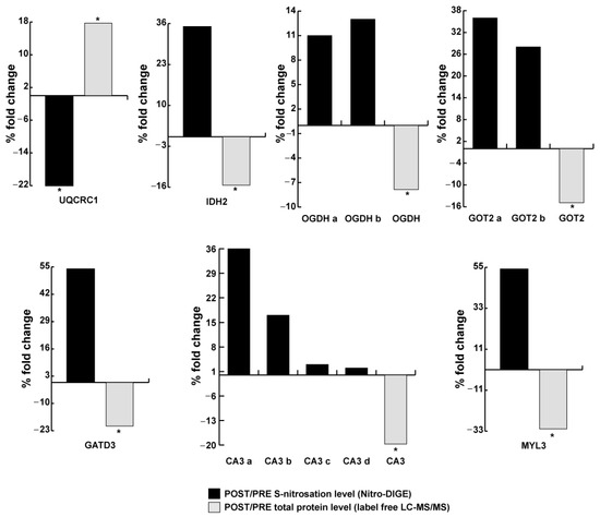 Figure 6 presents the relation between level of nitrosylation and protein abundance in LDM astronauts. A significant decrease in nitrosylation despite an increase in protein abundance was observed for UQCRC1. At variance, for isocitrate dehydrogenase [NADP] (IDH2), proteoforms of OGDH, mitochondrial aspartate aminotransferase proteoforms (GOT2 a, b), glutamine amidotransferase-like class 1 domain-containing protein 3 (GATD3), proteoforms of CA3, and MYL3, the total abundance was decreased, while levels of nitrosylation were increased, although not significantly changed.