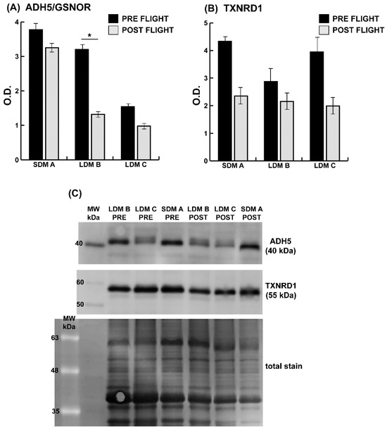 Immunoblots of cytosolic denitrosylation enzymes in SDM vs. LDM astronaut soleus. Representative histograms (means ± SD) showing protein abundance of (A) alcohol dehydrogenase 5/S-nitrosoglutathione reductase (ADH5/GSNOR) and (B) thioredoxin reductase 1 (TXNRD1) in preflight (black bars) vs. postflight (grey bars) in one (SDM A) astronaut, and two (LDM-B/-C) astronauts. (C) Representative immunoblot images from pre- vs. postflight SDM-A and LDM-B/-C. Data were normalized against the total amount of loaded proteins stained with Sypro Ruby. O.D. = optical density; * significant difference; Student’s t-test, n = 2, p < 0.05. Full-length images are available in the Supplementary Materials.
