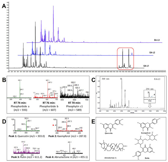 HPLC/MS analysis of EA leaf extracts. (A) Comparison of HPLC chromatogram of EA-L1, EA-L2, and EA-L3 extracts. Red rectangle represents the chlorophyll-related hydrophobic compounds present in EA-L1. (B) Chlorophyll-related compounds identified by HPLC/MS analysis of EA L1 extract. (C) HPLC chromatogram of EA-L3 at 360 nm and 254 nm (for triterpenes). (D) Corresponding molecular ion peaks of identified flavonoids and triterpene on EA-L3. (E) Chemical structure of compounds (Peak 1: Quercetin, Peak 2: Kaempferol, Peak 3: Rutin, and Peak 4: Abruslactone).