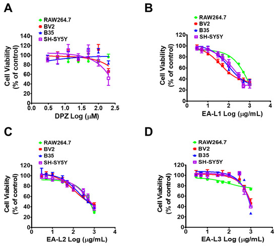 Initially, the cytotoxicity of each extract was tested on RAW 264.7 cells, a mouse macrophage, BV2 microglial, B35, a rat neuroblastoma, and SH-SY5Y, a human neuroblastoma cell, to establish the non-cytotoxic doses of EA-L1, L2, and L3. RAW264.7 and BV2 cells were utilized to evaluate the systemic effect, as macrophages are present in all tissues and are the standard cell model to assess the anti-inflammatory activity promoted by plant extracts. We also determined the cytotoxicity of the standard drug DPZ in the respective cell lines. All four cell lines were treated with DPZ (3–200 μΜ) for 24 h. DPZ showed no toxicity to the RAW264.7 and B35 cell lines up to 200 μΜ (IC50 > 200 μM). However, DPZ showed slight toxicity at 200 μΜ in BV2 and SH-SY5Y (IC50 > 200 μM) (Figure 3A).