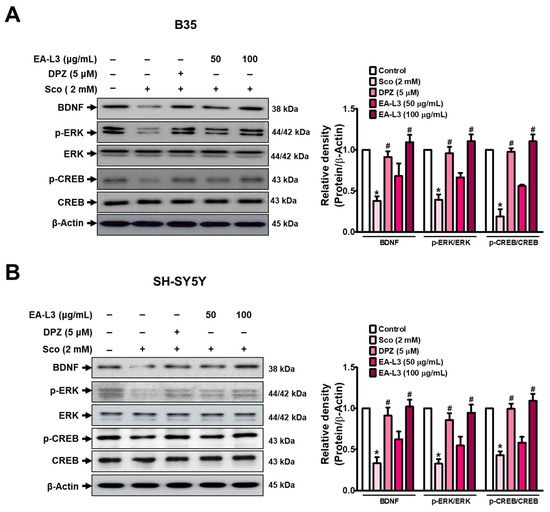 Effect of EA-L3 on scopolamine-triggered expression of memory-related molecular markers in B35 and SH-SY5Y cells. Cells were treated with EA-L3 at the indicated concentration, and the extracted protein was analyzed to determine BDNF, p-ERK, and p-CREB protein levels in (A) B35 and (B) SH-SY5Y cells. The data presented are the means ± SD of three independent experiments and were analyzed by one-way ANOVA with Tukey’s post hoc test. * p < 0.05 vs. control group; # p < 0.05 vs. scopolamine-treated group.