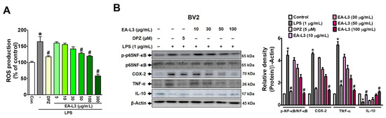 The study next investigated whether LPS-induced ROS levels were indeed decreased in BV-2 microglial cells with EA-L3 (≥300 μg/mL) (Figure 5A). We chose an EA-L3 concentration of up to 300 μg/mL for this experiment since it did not affect cell viability. These results confirmed that EA-L3 dramatically suppressed intracellular ROS generation in a concentration-dependent manner compared to the vehicle-treated control. DPZ (5 μM) significantly blocked LPS-mediated ROS production in BV2 microglial cells.