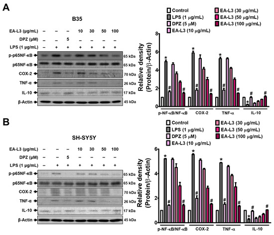 EA-L3 prevents LPS-induced expression of TNF-α and COX-2 while increasing the expression of IL-10 in neuroblastoma cell lines. The cell lines were treated alone or co-treated with LPS (1 μg/mL) and EA-L3 (10, 30, 50, and 100 μg/mL) or DPZ (5 μΜ) for 24 h, and total protein was extracted. Western blot was performed for the analysis of the protein levels of p-p65NF-κB, COX-2, TNF-α, and IL-10. Cell lines used were (A) B35 and (B) SH-SY5Y cells. The data presented are the means ± SD of three independent experiments and were analyzed by one-way ANOVA with Tukey’s post hoc test. * p < 0.05 vs. control group; # p < 0.05 vs. LPS-treated group.