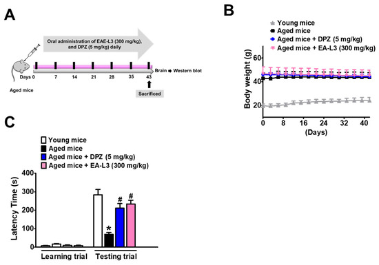 Oral administration of EA-L3 to aged mice results in significantly improved cognitive performance. (A) Experimental outline of aged mice. Aged mice were given oral administration of either normal saline, DPZ (5 mg/kg), or EA-L3 (300 mg/kg), respectively, for 42 days. (B) Body weight and (C) Passive Avoidance Test. n = 5 for 6-week mice groups and for 24-month mice groups. Data were shown as mean ± SD (n = 5). Significance was evaluated using a one-way ANOVA with Tukey’s post hoc test. * p < 0.01, compared with young mice; # p < 0.01, compared with vehicle-treated aged mice.