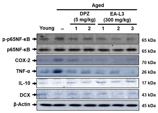 The levels of TNF-α, IL-10, and COX-2 were measured in the brains of aged and EA-L3-administered mice. Aged mice had higher levels of proinflammatory mediators, TNF-α, and COX-2 protein expression, and a reduced expression of the anti-inflammatory cytokine IL-10. Administrations of EA-L3 extract decreased TNF-α and COX-2 protein expression in the hippocampus compared with untreated aged mice. In addition, EA-L3-treated mice showed increased IL-10 expression compared with untreated aged mice. EA-L3 supplementation also increased the neurogenesis marker DCX in aged mice (Figure 8). These results suggest that EA-L3 can reduce proinflammatory markers and increase anti-inflammatory and neurodevelopmental markers in aged mice.