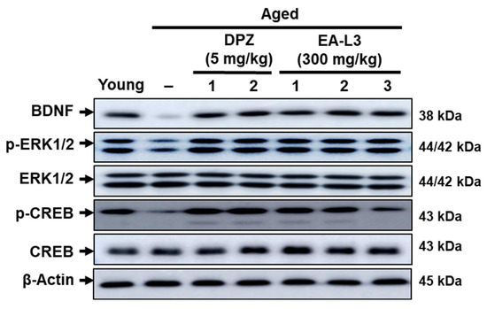 By using Western blot analysis, we were able to examine the expression levels of BDNF, p-ERK, and p-CREB in order to gain insight into the potential mechanism of cognitive enhancements in the brain tissue of elderly mice for EA-L3. As the hippocampus is central to learning and cognitive functions in the brain, BDNF expression was found to decrease in the hippocampus of aged mice. However, EA-L3 (300 mg/kg) treatment regained hippocampal BDNF protein expression in aged mice compared with vehicle-treated aged mice. The recovery of BDNF by EA-L3 treatment was consistent with DPZ treatment (Figure 9). In addition, because the BDNF-induced activation of the ERK/CREB signaling pathway is crucial for hippocampal neurogenesis and cognition improvement, we also examined the related phosphorylation of ERK and CREB. The administration of EA-L3 and DPZ increased ERK and CREB phosphorylation in the hippocampus of aged mice, similar to that of young mice. These results indicate that EA-L3 can improve age-dependent hippocampal cognitive decline by activating ERK/CREB signaling and increasing BDNF protein expression.