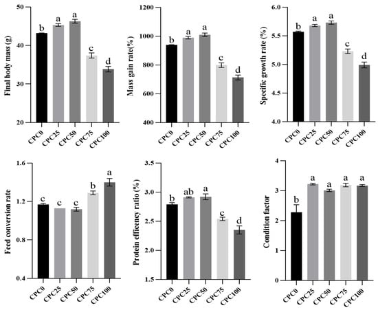 Parameters of growth and feed utilization of common carp-fed diets with fish meal substituted by CPC. Values were presented as mean ± SE. Bars with different letters indicated significant differences (p < 0.05). Note: Mass gain rate (MGR, (%) = 100 × [(final mass − initial mass)]/initial mass; Specific growth rate (SGR, %/d) = 100 × [(Ln final mass − Ln initial mass)/56 days]; Feed conversion rate (FCR) = [100 × total feed intake/(final mass − initial mass)]; Protein efficiency ratio (PER, %) = 100% × [final mass (g) − initial mass (g))/(total feed intake (g) × content of dietary protein (%)]; Condition factor (CF, g/cm3) = mass (g)/length3 (cm).