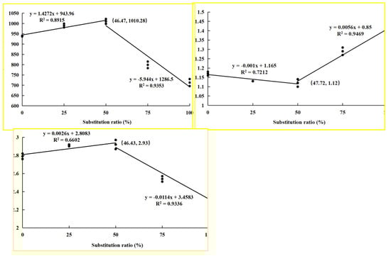 No mortality occurred in all groups across the feeding period. Growth parameters such as final body mass, MGR, SGR, and CF were evaluated. The CPC25 and CPC50 groups showed a significantly positive effect on final body mass, MGR, and SGR in comparison with the CPC0 group (p < 0.05), whereas the CPC75 and CPC100 groups showed a significantly negative effect. With regard to CF, all CPC replacement groups obtained significantly higher values than the CPC0 group (p < 0.05). Feed utilization parameters, including FCR and PER, were calculated. The markedly lower FCR was observed in the CPC50 group compared to the CPC75 and CPC100 groups (p < 0.05); consequently, a markedly higher PER was also evident during the feeding period for the CPC50 group than the CPC0, CPC75, and CPC100 groups (p < 0.05) (Figure 1). Based upon the broken-line regression analysis of MGR, PER, and FCR against CPC replacement levels, the optimal CPC replacement levels were, respectively, 46.47%, 47.72%, and 46.43% of the feed (Figure 2).