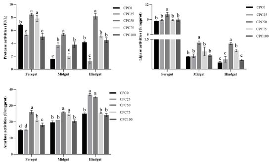 Intestinal digestive enzyme activities of common carp-fed diets with fish meal substituted by CPC. Values were presented as mean ± SE. Bars with different letters indicated significant differences (p < 0.05).