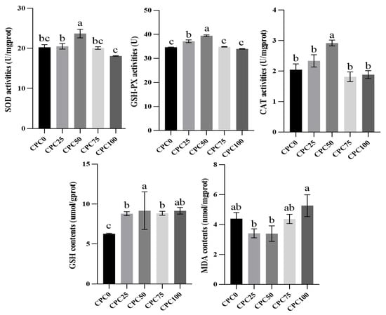 As shown in Figure 4, 25% and 50% replacement of fish meal with CPC triggered the increments of SOD, CAT, and GSHPx activities in the intestines. Specifically, markedly higher activities of three enzymes were found in the CPC50 group. CPC replacement brought higher intestinal GSH contents, and the CPC50 group possessed significantly higher GSH contents than the other groups (p < 0.05). Regarding the MDA contents, significant reductions in the CPC25 and CPC50 groups were observed compared to the CPC100 group (p < 0.05).