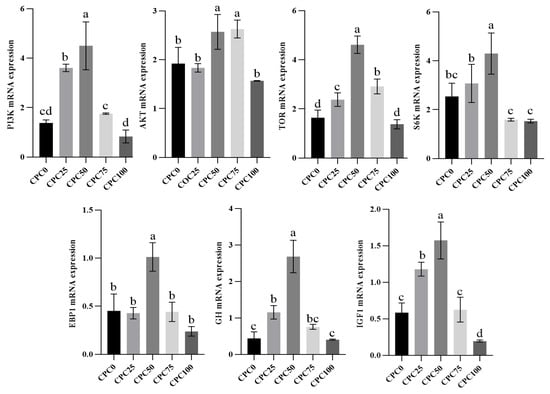 In the intestine, the relative expressions of GH, IGF1, PI3K, AKT, TOR, S6K, and 4ebp1 in each group first increased and then decreased, reaching the highest levels in the CPC50 group. For the growth axis genes, the GH and IGF1 relative expressions in the CPC50 group were significantly up-regulated compared to the other groups (p < 0.05). For the protein synthesis genes, the relative expressions of PI3K, TOR, S6K, and 4ebp1 in the CPC50 group were markedly higher than the other groups (p < 0.05). Meanwhile, it also needs to be mentioned that all the relative expressions of growth axis and protein synthesis genes reached the lowest levels in the CPC100 group. Of these, the relative expressions of IGF1, PI3K, and TOR in the CPC100 group were markedly down-regulated compared to the CPC25, CPC50, and CPC75 groups (p < 0.05) (Figure 5).