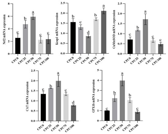 As the key actor involved in antioxidation, we studied the genes coding for Nrf2, Keap1, CuZnSOD, CAT, and the GPx1b protein. Significant differences in the expression of studied genes were found among five diets (p < 0.05). The relative expression levels of Nrf2, CuZnSOD, CAT, and GPx1b were significantly elevated in the CPC50 group (p < 0.05). Conversely, the relative expression levels of Keap1 in the CPC50 group were significantly decreased (p < 0.05). Noteworthy, the CPC100 group obtained the lowest expression levels of Nrf2, CuZnSOD, CAT, and GPx1b and the highest Keap1 expression level. Of these, the CAT expression level in the CPC100 group was significantly lower than the other group (p < 0.05), whereas the Keap1 expression level in the CPC100 group was significantly higher than the other group (p < 0.05) (Figure 6).