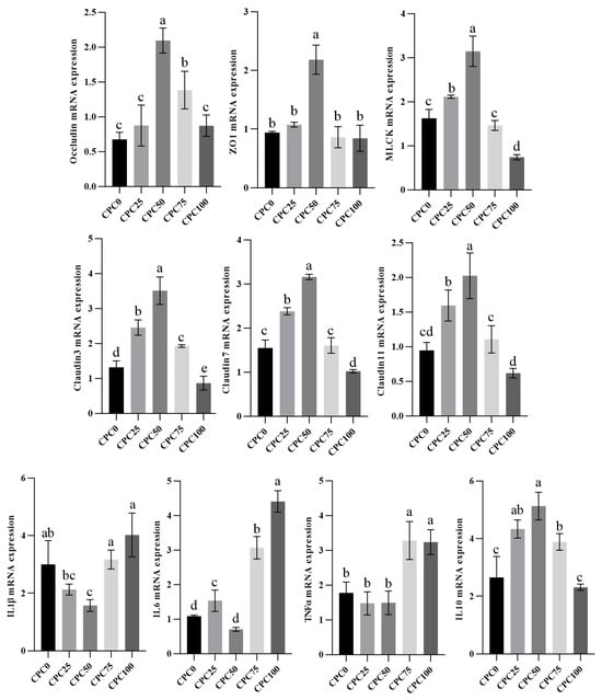 Regarding proinflammatory factors (IL1β, IL6, and TNF-α) in the intestine, the highest relative expressions were observed in the CPC100 group, while the lowest relative expressions appeared in the CPC50 group. Concretely, the CPC100 group possessed markedly higher IL6 relative expressions than the other group, markedly higher IL1β relative expression than the CPC25 and CPC50 groups, and markedly higher TNF-α relative expression than the other groups except the CPC75 group (p < 0.05). On the contrary, the CPC100 group obtained markedly lower IL10 (anti-inflammatory factor) relative expression in comparison to the other groups except the CPC0 group (p < 0.05). Noteworthy, the markedly highest IL10 (anti-inflammatory factor) relative expression was observed in the CPC50 group (p < 0.05) (Figure 7).