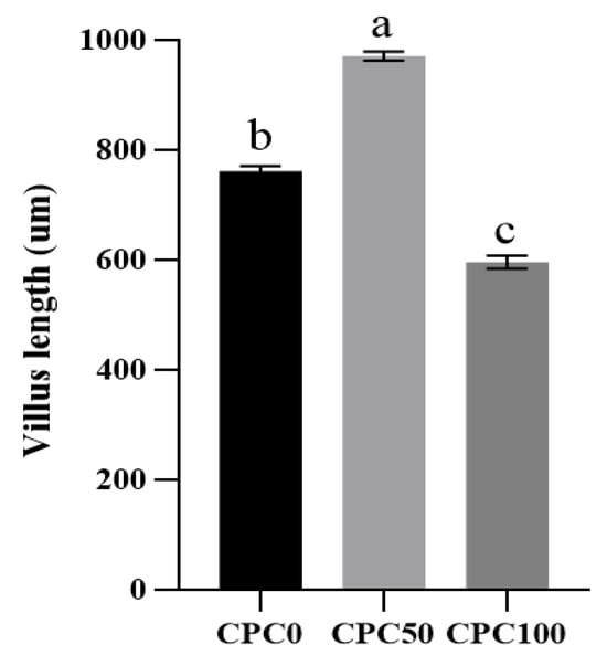 Intestinal villus height of common carp fed diets with fish meal substituted by CPC. Values were presented as mean ± SE. Bars with different letters indicated significant differences (p < 0.05).