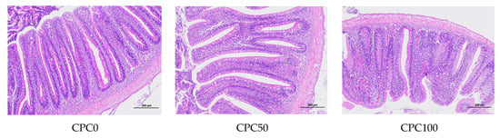 Table 3 showed that the contents of TP, ALB, and HDL-C initially increased and then decreased, and the CPC50 group showed significantly higher TP content than the CPC0 and CPC100 groups, and significantly higher HDL-C content than the other groups (p < 0.05). On the contrary, the contents of BUN, TG, and LDL-C showed an opposite tendency, and their minimum values were found in the CPC50 group. Specifically, the CPC50 group possessed lower BUN and HDL-C contents than the other groups except the CPC25 group and lower LDL-C contents than the CPC100 group (p < 0.05). In addition, compared with the other groups except CPC50, the ALT in the CPC75 group was significantly higher (p < 0.05). Compared with the other groups, the AST in the CPC100 group was significantly higher (p < 0.05).