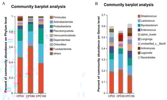 In combination with the comparison results of microbiota taxa at the genus level, the four primary genera (relative abundance > 5% at least in one sample) were Streptococcus, Lactococcus, Mycobacterium, and Enterococcus (Figure 11B). As Figure 11B illustrates, the relative abundances of Streptococcus and Lactococcus were statistically elevated in the CPC50 group, whereas the relative abundance of Enterococcus were statistically reduced in the CPC50 group compared to the CPC0 and CPC100 groups.
