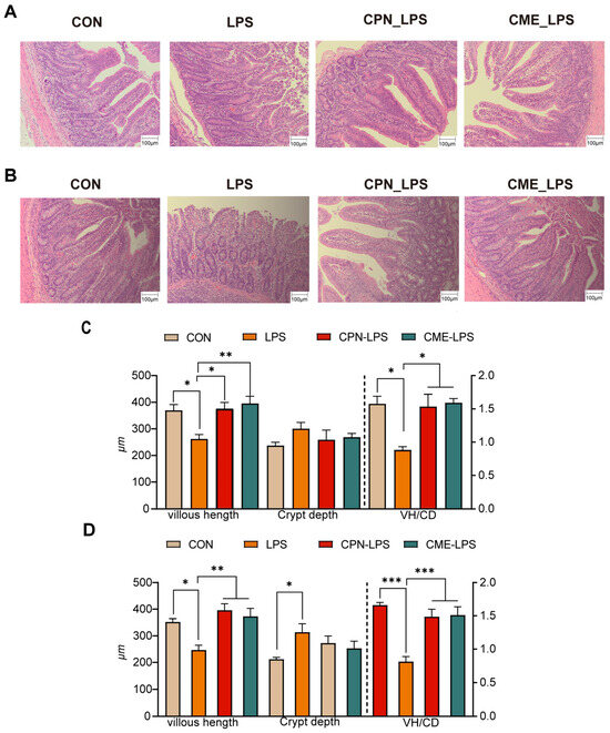 Intestinal morphological and functional integrity is a key indicator of nutrient absorption and gut health [24]. Cordyceps militaris powder prophylactic supplementation alleviated intestinal mucosal barrier damage and attenuated the intestinal histological pathology in DSS-induced UC mice [32]. In the present experiment, we observed that LPS induction significantly reduced the villus height and villus height to crypt depth ratio after the intraperitoneal injection of LPS, whereas the CPN and CME treatments attenuated the damage to the intestinal morphology, which is consistent with previous reports [8,33]. Interestingly, the CME treatment showed better therapeutic effects in the jejunum compared to the CPN treatment.