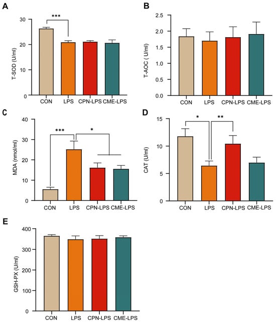 In this experiment, serum antioxidant indices (T-AOC, T-SOD, MDA, CAT and GSH-PX) were measured to assess the effects of CPN or CME on LPS-induced intestinal inflammation in piglets. As shown in Figure 2, LPS significantly decreased the levels of T-SOD (p < 0.001) and CAT (p < 0.05; Figure 2A,D), while significantly increasing the levels of MDA (p < 0.001) compared to the CON group; meanwhile, the CPN and the CME prevented the increase in MDA by LPS injection (p < 0.05; Figure 2C). In addition, the CPN treatment prevented a LPS-induced decrease in the CAT level (p < 0.01). In contrast, the CME treatment did not affect the CAT content (Figure 2D). There were no significant differences in T-AOC and GSH-PX across the four groups (p > 0.05; Figure 2B,E).