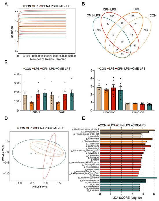 To determine the composition of the ileal microbiota, 16sRNA gene amplicon sequencing analysis was performed. The Shannon–Wiener index illustrates the microbial diversity index by sequencing samples at different depths (Figure 4A). Moreover, the Venn plot shows that the specific OTUs for the CON group, LPS group, CPN-LPS group and CME-LPS group are 383, 136, 356, 579, respectively (Figure 4B). Furthermore, the richness and diversity of the microbial communities of the samples were reflected by Alpha diversity analysis. There were no significant differences in the richness and diversity indices, including the Chao 1 index, ACE index, Shannon index and Simpson index, among the four treatments (p > 0.05; Figure 4C). The Bray–Curtis algorithm-based PCoA (Figure 4D) revealed that the first principal component (PCoA1) and the second principal component (PCoA2) explained 25.00% and 24.00% of the variation in the microbial diversity, respectively. Meanwhile, the LEfSe analyses and LDA score showed significant differences in species abundance at the phylum level and genus level across groups (Figure 4E). There were 28 discriminative species identified among the four treatments in the ileal digesta of piglets. Clostridium_sensu_stricto_1, Corynebacterium, Prevotellaceae_UCG_001 and Prevotella were enriched in the CON group; Romboutsia, Terrisporobacter and Turlclbacter were enriched in the LPS group; Bacteroidota, Prevotella_9, Prevotella_7 and Allprevotella were enriched in the CPN-LPS group; and Campylobacterota, Spirochaetota, Hellcobacter and Prevotella_9 were significantly enriched in the CME-LPS group.