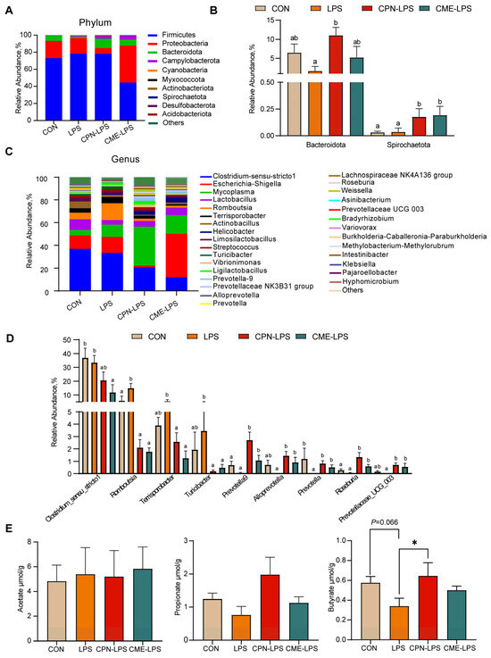 The results of the further analysis of the differential species and microbiota structure are shown in Figure 5. The relative abundance of different phylum levels shows that the dominant bacterial groups were Firmicutes, Proteobacteria, Bacteroidota and Campylobacterota (Figure 5A). LPS reduced the relative abundance of Bacteroides compared with the CON group (p < 0.1), and the treatment of CPN alleviated the LPS-induced challenge and increased the abundance of Bacteroides (p < 0.05). Compared to the CON group and LPS group, the treatment of CME and CPN significantly increased the relative abundance of Spirochaetota (p < 0.05; Figure 5B). Among the top 30 genera in terms of relative abundance, compared to the CON group, LPS significantly increased the relative abundances of Romboutsia (p < 0.05) and significantly decreased the relative abundances of Prevotella (p < 0.05); the relative abundance of Prevotellaceae UCG-003 shows a decreasing trend (p < 0.1), whereas supplementation with CPN and CME attenuated LPS-induced increases in Romboutsia and decreases in Prevotella and Prevotellaceae UCG-003 (p < 0.05; Figure 5C,D). Furthermore, the relative abundance of Terrisporobacter and Turicibacter was significantly reduced (p < 0.05), while the relative abundance of Prevotella-9, Alloprevotella and Roseburia was significantly increased (p < 0.05) in piglets from the CPN-LPS and CME-LPS groups compared to those from the LPS group. Additionally, the relative abundance of Prevotella-9 and Roseburia was significantly upregulated in the CPN treatment group compared to the control group (p < 0.05). Nevertheless, the CME treatment significantly downregulated the relative abundance of Clostridium-msensu-stricto1 compared to the CON and LPS groups (p < 0.05). Strikingly, compared to the CPN-LPS group, the relative abundance of Escherichia-Shigella was significantly increased in the CME-LPS group (p < 0.01). Taken together, CPN and CME differentially modified the gut microbiota.
