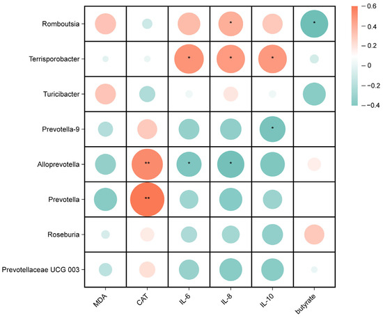 Spearman correlation analyses were performed to investigate the potential associations between gut microbes and biochemical parameters in weaned piglets, including oxidative indicators, inflammatory factors, and SCFAs. As shown in Figure 7, for the microorganisms of the ileal digesta genus, the relative abundance of Romboutsia was positively correlated with IL-8 (p < 0.05) and negatively correlated with the butyrate content (p < 0.05), the relative abundance of Terrisporobacter was positively correlated with IL-6, IL-8, and IL-10 (p < 0.05), the relative abundances of Alloprevotella and Prevotella were positively correlated with CAT (p < 0.01), and the relative abundance of Alloprevotella was negatively correlated with IL-6 and IL-8 (p < 0.05).