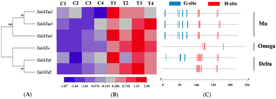 Phylogenetic analysis revealed that the six genes clustered into three distinct GST families: three Mu family GSTs, one Omega family GST, and two Delta family GSTs (see Figure 2A). Notably, TuGSTm2 and TuGSTm3 exhibited the closest evolutionary relationship, while TuGSTd1 and TuGSTd2 also showed a close evolutionary association. This phylogenetic arrangement provides insights into the evolutionary relationships among the GST genes under investigation.