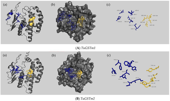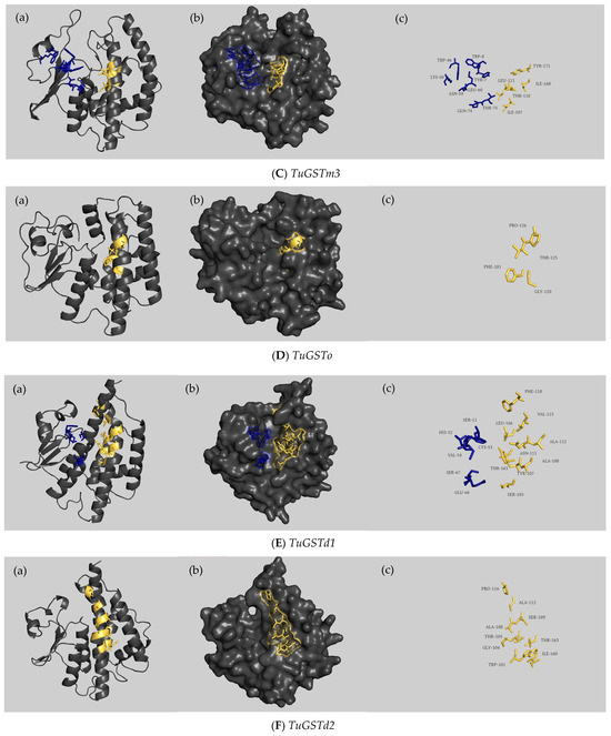 The overall predicted structure of the six GSTs ((A) TuGSTm1; (B) TuGSTm2; (C) TuGSTm3; (D) TuGSTo; (E) TuGSTd1; and (F) TuGSTd2). (a) Visualization of GST structure in cartoon; G-sites are shown with blue stick structure, and H-sites are shown with yellow stick structure. (b) Surface representation of GST genes and the active binding sites are highlighted. Active site residues that are conserved in all GSTs are highlighted in blue and yellow. The blue part indicates the GSH-binding active sites, and the yellow part indicates the substrate-binding sites. (c) All the active sites of GSTs. The amino acid stick structure at the G-sites is shown in blue, and the amino acid stick structure at the H-sites is shown in yellow. The structural model was built using AlphaFold2 and the results were visualized using PYMOL.