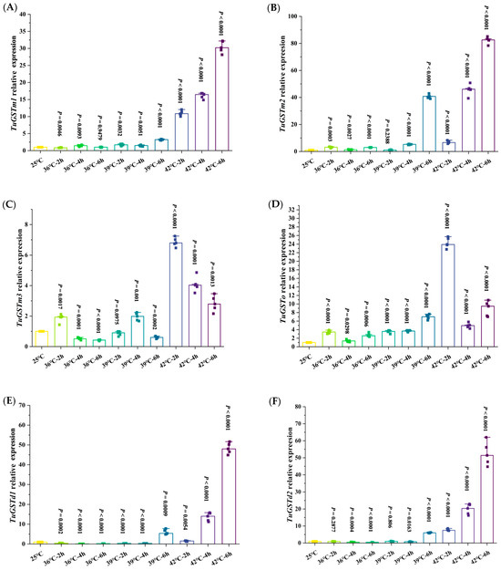 When exposed to 36 °C, the relative expression level of TuGSTd1 was significantly down-regulated and reached the minimum at 36 °C for 6 h. At 39 °C, the relative expression level of TuGSTd1 was significantly up-regulated only after exposure at 39 °C for 6 h. At 42 °C, the relative expression levels of TuGSTd1 were significantly up-regulated; they increased with the extension of exposure time, and reached the maximum at 42 °C for 6 h (Figure 4E).