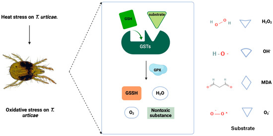 The role of GST in response to short-term heat stress in T. urticae. Two domains on the subunits together constitute the active center of GSTs: an N-terminal GSH-binding domain (G-site) and a C-terminal hydrophobic substrate-binding domain (H-site). The harmful substances produced by oxidative stress caused by heat stress mainly include ROS and lipid peroxides. GPX catalyzes the binding of GST and substrate, completes the metabolism of the substrate, and catalyzes GSH to become GSSH in the case of GSH as an electron donor (GPX: Glutathione peroxidase; GSSH: Glutathione(Oxidized); GSH: Glutathione).