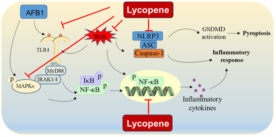 AFB1-induced inflammatory response and proposed modulation of lycopene. Lycopene supplementation could reduce AFB1 exposure-induced inflammatory response via the inhibition of formation of NLRP3-mediated inflammasome, NF-κB pathway, MAPK pathway, and NLRP3 pathway. It also may be partly attributed to the inhibition of ROS production.