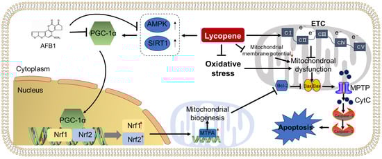 Lycopene supplementation attenuated AFB1-induced mitochondrial dysfunction and apoptotic cell death. AFB1 exposure could inhibit the activation of PGC-1α directly or indirectly via the inhibition of AMPK and SIRT1 proteins, then reduce the mitochondrial biogenesis via the Nrf1/Nrf2/MTFA pathway, and, finally, ameliorate mitochondrial dysfunction and apoptosis. Lycopene supplementation could protect AFB1 exposure-induced mitochondrial dysfunction and apoptosis via the activation of the PGC-1α pathway, the inhibition of oxidative stress and the loss of mitochondrial membrane potential, and the activation of the mitochondrial apoptotic pathway.