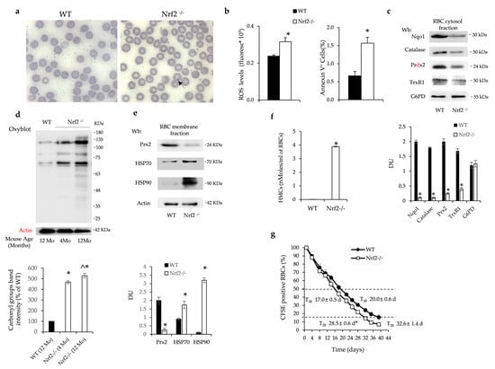 Nrf2−/− mouse red cells display increased membrane oxidation resulting in accelerated senescence (a) Representative May–Grunwald–Giemsa staining for the morphology of red cells from wild-type (WT) and Nrf2−/− mice. Arrow indicates Howell–Jolly body in Nrf2−/− mouse red cells. Original magnification ×100. (b) ROS values in red cells and Annexin-V+ erythrocytes from WT and Nrf2−/− mice. Data are presented as means ± SD (n = 4) * p < 0.05 compared to WT. (c) Western blot (Wb) analysis using specific antibodies against Nqo1, Catalase, Prdx2, TrxR1 and G6PD of the cytosolic fraction of red cells from WT and Nrf2−/− mice. A representative gel of these four proteins is shown (upper panel). Densitometric analysis of immunoblots shown in the lower panel. Data are presented as means ± SD (n = 4); * p < 0.05 compared to WT mice. DU: densitometric unit. (d) Oxyblot analysis of the ghost fraction of red cells from WT and Nrf2−/− mice at 4 and 12 months (Mo) of age. A representative gel of the other four is shown (upper panel). Actin is used as loading control. Densitometric analysis is shown in the lower panels. Data are presented as means ± SD (n = 4); * p < 0.05 compared to WT mice (12 Mo); ^ p < 0.05 compared to Nrf2−/− mice at 4 Mo of age. (e) Wb analysis using specific antibodies against Prdx2, HSP70 and HSP90 of the ghost fraction of red cells from WT and Nrf2−/− mice. A representative gel is shown (upper panel). Actin is used as protein loading control. Densitometric analysis of immunoblots is shown in the lower panel. Data are presented as means ± SD (n = 4); * p < 0.05 compared to WT mice. (f) Hemichrome quantification in red cells from WT and Nrf2−/− mice at 12 months of age. Data are presented as means ± SD (n = 4); * p < 0.05 compared to WT mice. (g) Survival of CFSE-labeled red cells from WT and Nrf2−/− mice at 12 months of age (n = 6–7). Data are mean ± SD. * p < 0.05 compared to T20 in WT mice.