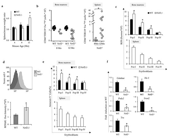 The absence of Nrf2 promotes ineffective erythropoiesis and increased oxidation of erythroblasts. (a) Spleen weight/mouse weight ratio of wild-type (WT) and Nrf2−/− mice at 4, 8 and 12 months (Mo) of age. Data are presented as means ± SD (n = 4–12) * p < 0.05 compared to WT. (b) Flow cytometric analysis, combining CD44-Ter119 and cell size marker strategy (CD44+/Ter119+/FSChigh), of the erythropoietic activity in the bone marrow and spleen from WT and Nrf2−/− mice at 8 and 12 months (Mo) of age. Data are presented as single dots (n = 4–12) * p < 0.05 compared to WT. (c) ROS values in bone marrow and spleen erythroblasts from WT and Nrf2−/− mice at 12 months of age. Data are presented as means ± SD, * p < 0.05 compared to WT. (d) DNA oxidative damage measured flow cytometrically as 8OHdG fluorescence intensity of erythroblast populations from WT and Nrf2−/− mice at 12 months of age. Data are presented as means ± SD, * p < 0.05 compared to WT. (e) Amount of Annexin V+ cells in bone marrow and spleen erythroid precursors from Nrf2−/− and WT mice as in (c); * p < 0.05 compared to WT. (f) mRNA expression of catalase, Ho-1, Prdx2, Srxn2 and Trx by qRT-PCR in erythroblasts from WT and Nrf2−/− mice (fold on WT). Experiments were performed in triplicate. * p < 0.01, Nrf2−/− vs. WT mice. p value was calculated by t-test.