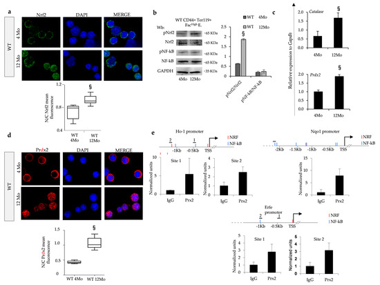 In aging wild-type mice, erythroblasts show age-dependent activation of Nrf2 associated with nuclear translocation of Prdx2, which is recruited in promoter regions of Nrf2. (a) Nrf2 immunostaining of sorted erythroid precursors from bone marrow of 4- and 12-month-old wild-type (WT) mice. DAPI was used to stain nuclei. Nrf2 mean fluorescence in the nucleus and cytoplasm was measured using ImageJ (https://imagej.net/ij/download.html). At least 25 cells were analyzed in 6 different fields of acquisition. Data are presented as median and minimum/maximum, with boxes indicating 25th–75th percentiles. § p < 0.05 compared to 4-month-old WT mice. Original magnification 100×. (b) Wb analysis with specific anti-phospho-Nrf2 (p-Nrf2), Nrf2, phospho-NF-kB(p-NF-kB) and NF-kB in sorted erythroid precursors in bone marrow of 4- and 12-month-old WT mice. GAPDH was used as protein loading control. A representative gel is shown. Densitometric analysis of immunoblots is shown in the right panel. Data are presented as means ± SD (n = 4); § p < 0.05 compared to 4-month-old WT mice. DU: densitometric unit (c) mRNA expression of catalase and Prdx2 by qRT-PCR of erythroblasts from WT mice at 4 and 12 months of age. Data are mean ± SD (n = 6–8). Experiments were performed in triplicate. § p < 0.01, WT 4Mo vs. WT 12Mo mice. p value was calculated by t-test. (d) Prdx2 immunostaining of sorted erythroid precursors from bone marrow of 4- and 12-month-old wild-type (WT) mice. DAPI was used to stain nuclei. Prdx2 mean fluorescence in the nucleus and cytoplasm was measured using ImageJ. At least 40 cells were analyzed in 5 different fields of data acquisition. Data are presented as median and minimum/maximum, with boxes indicating 25th–75th percentiles; § p < 0.01, WT 4Mo vs. WT 12Mo mice. Original magnification 100×. (e) Predicted NRF and NF-kB binding sites in the indicated promoters are shown in red and blue, respectively. Horizontal bars indicate the regions amplified in the ChIP experiment. Histograms show qPCR quantification of a ChIP assay with the indicated antibodies from cells treated as above. Error bars indicate standard deviations.