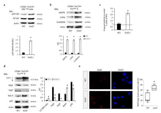 Since the absence of Nrf2 negatively impacts erythropoiesis during aging, we hypothesized that stress-sensitive transcription factor NF-kB might be activated to support stress erythropoiesis in Nrf2−/− mice. Indeed, we found increased NF-kB activation in sorted erythroblasts from Nrf2−/− mice compared to wild-type animals (Figure 4a). Other adaptive mechanisms against sustained oxidation such as UPR and autophagy could also be involved. In sorted Nrf2−/− erythroid precursors, we found increased expression of (i) HSP70 and (ii) ATF6, which is one of the three UPR sensors and upregulates the expression of the pro-apoptotic protein GADD34 towards the caspase-3 cascade (Figure 4b). Indeed, we found a significantly increased activity of caspase-3 in sorted Nrf2−/− mouse erythroblasts compared to wild-type cells (Figure 4c).