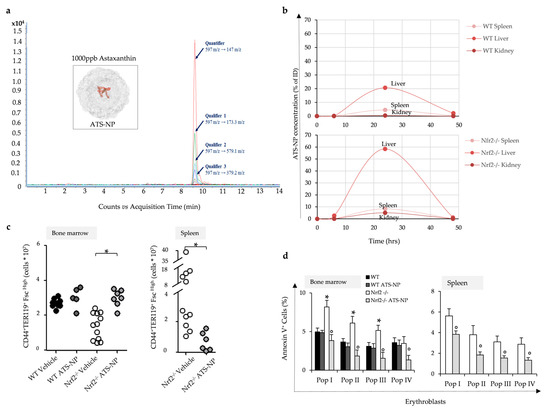Astaxanthin PLGA nanoparticles improve Nrf2−/− mouse ineffective erythropoiesis. (a) Extracted ion chromatogram for astaxanthin illustrates three qualifier transitions and was used to confirm molecule identification. Inset: ATS-NP: pictorial representation of PLGA nanoparticles embedding astaxanthin; the relationship between the different molecules is illustrative. (b) Organ distribution of astaxanthin molecules in the two mice strains during treatment determined by mass spectrometric analysis (see also Figure S6d and Table S1). (c) Flow cytometric analysis, combining CD44-Ter119 and cell size marker strategy (CD44+/Ter119+/FSChigh), of the erythropoietic activity in the bone marrow and spleen from WT and Nrf2−/− mice treated with vehicle or ATS-NPs (2 mg/kg every two days for four weeks). Data are presented as single dots (n = 5–12) * p < 0.05 compared to vehicle-treated WT mice. (d) Amount of Annexin V+ cells in erythroid precursors from bone marrow and spleen of WT and Nrf2−/− mice treated as in (c). Data are presented as means ± SD; * p < 0.05 compared to WT mice, ° p < 0.05 compared to vehicle-treated mice.
