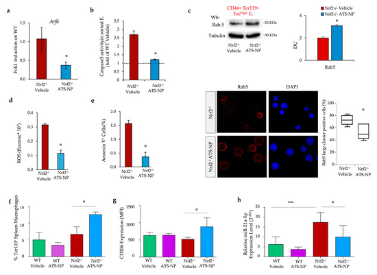 The beneficial effects of ATS-NPs on Nrf2−/− mouse erythropoiesis were also supported by (i) the downregulation of Atf6 expression (Figure 6a), (ii) a reduction in caspase-3 activity (Figure 6b) and (iii) the improvement of autophagy with the clearance of large Rab5 clusters (Figure 6c lower panel).