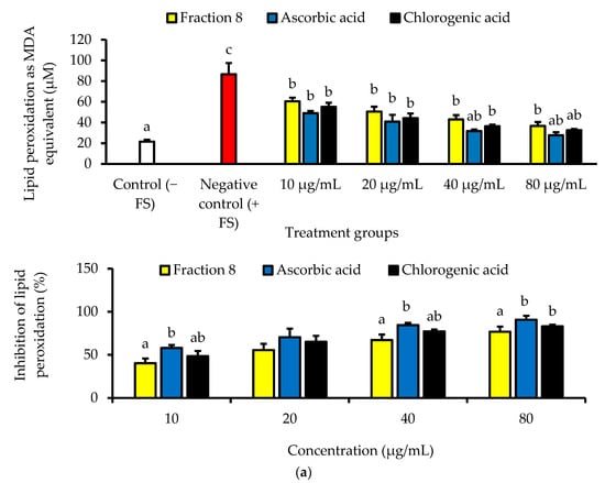 The ability of fraction 8 and chlorogenic acid to inhibit FeSO4-induced (FS) linoleic acid peroxidation was performed. The detailed protocol for this assay has recently been reported in our publication [23]. In summary, linoleic acid (50 mM) peroxidation was induced using FeSO4·7H2O (FS) (2 mM in assay volume) after pre-treatment with the different concentrations (5, 10, 20, 40, and 80 µg/mL in assay volume) of the samples and ascorbic acid (positive control). The thiobarbituric acid (TBA) method was used to measure the level of lipid peroxidation. Absorbance readings at 532 nm were used to compute the inhibitory potential of the tested samples on linoleic acid peroxidation as follows: