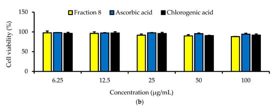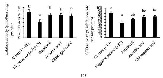 In Chang cells induced with oxidative stress, the anti-lipid peroxidative of ascorbic acid (IC50 = 5.74 µg/mL) was significantly (p < 0.05) and non-significantly (p > 0.05) stronger than that of fraction 8 (IC50 = 15.9 µg/mL) and chlorogenic acid (IC50 = 9.34 µg/mL), respectively (Table 4 and Figure 3a). Nevertheless, fraction 8, chlorogenic acid, and ascorbic acid (at 80 µg/mL) appreciably mitigated oxidative stress-induced depletion of catalase and SOD enzymes in the Chang cells (Figure 3b).