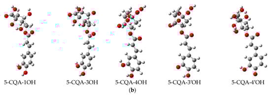 The DFT analysis data are presented in Table 5 and Figure 6. Figure 6a depicts the chemical structure of 5-CQA and the selected hydroxyl group numbering, as well as the lowest energy structural conformer of chlorogenic acid (5-CQA). Figure 6b shows the electron spin density of the optimized structures of 5-CQA radicals for HAT mechanism of DPPH radical scavenging.
