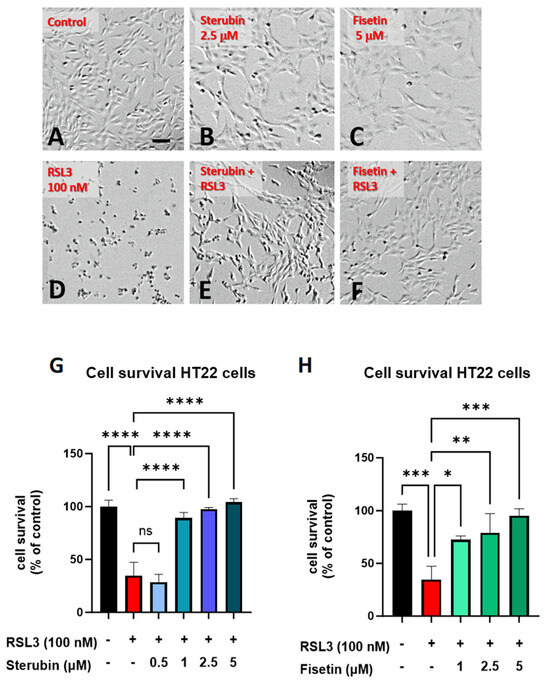 Sterubin and fisetin inhibit oxytosis/ferroptosis in HT22 cells. Representative micrographs of HT22 cells following treatment for 16 h: (A) 0.2% ethanol as vehicle control, (B) 2.5 μM sterubin, (C) 5 μM fisetin, (D) 100 nM RSL3, (E) 2.5 μM sterubin and 100 nM RSL3, and (F) 5 μM fisetin and 100 nM RSL3. Micrographs show the representative morphological characteristics of the cell cultures under a given condition of 16 experimental replicates. Scale bar = 100 μm. (G) Cell viability assessment. Cells were treated with 0.2% ethanol vehicle, 100 nM RSL3, and increasing concentrations of sterubin with 100 nM RSL3 for 16 h. (H) Cell viability assessment. Cells were treated either with 0.2% ethanol vehicle, 100 nM RSL3, and increasing concentrations of fisetin with 100 nM RSL3 for 16 h. The results are presented as the percentage of the neuroprotective activity relative to control (100%). Data are the mean of 3 replicates per condition ± SD. All data were analyzed by one-way ANOVA with Tukey’s multiple comparison test. * p < 0.05, ** p < 0.01, *** p < 0.001, and **** p < 0.0001 relative to control and relative to the 100 nM RSL3 treatment; ns, not significant.